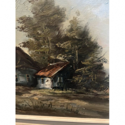 Przedstawia malowniczy pejzaż – wiejskie chaty otoczone drzewami, z widokiem na wodę i żaglówki.