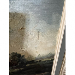 stan: ogólny bardzo dobry, widoczne miejscowe uszkodzenia płótna (widoczne na zdjęciu – do ewentualnej konserwacji).