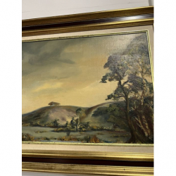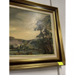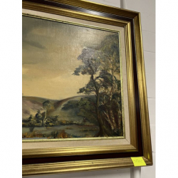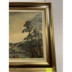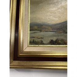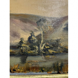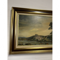 Malowniczy obraz przedstawiający krajobraz z jeziorem i drzewami na tle gór. Obraz namalowany na płótnie, oprawiony w złotą, ozdobną ramę. Dzieło sztuki w bardzo dobrym stanie, nadające się do dekoracji wnętrza. Możliwa wysyłka. Przedmiot dostępny w Pionkach.