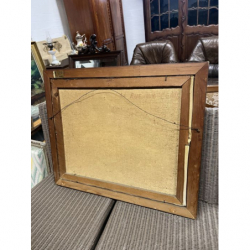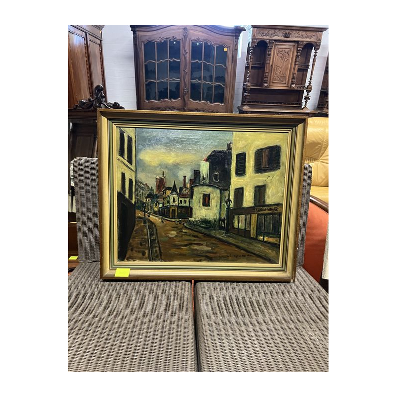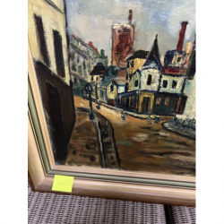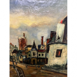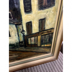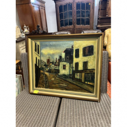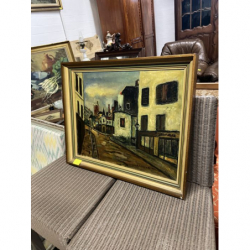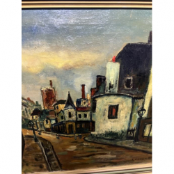 Malowany na płótnie obraz przedstawiający malowniczy miejski krajobraz.