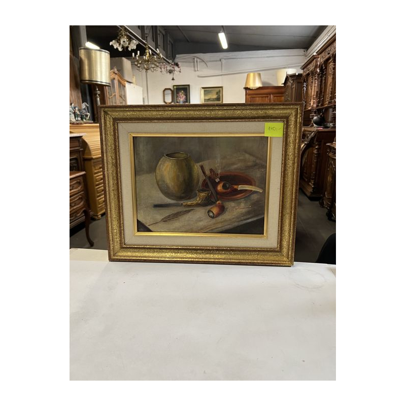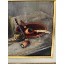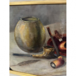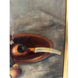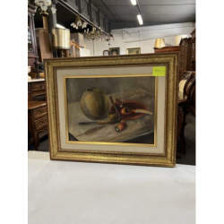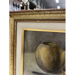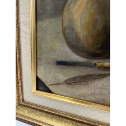 Obrazek martwej natury przedstawiający wazę, owoce i inne przedmioty na stole.