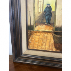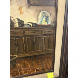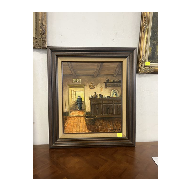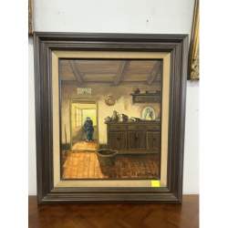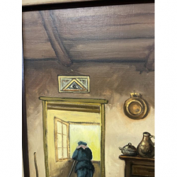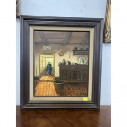 Malowany olejny obraz przedstawiający wnętrze wiejskiego domu w rustykalnym klimacie, podpisany przez artystę.