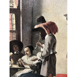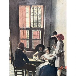 Na sprzedaż elegancki oleodruk przedstawiający klasyczną scenę rodzajową – grupa osób przy stole we wnętrzu w stylu XVII-wiecznym.
