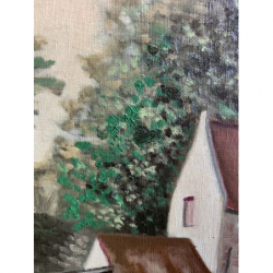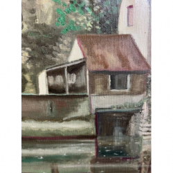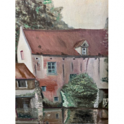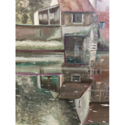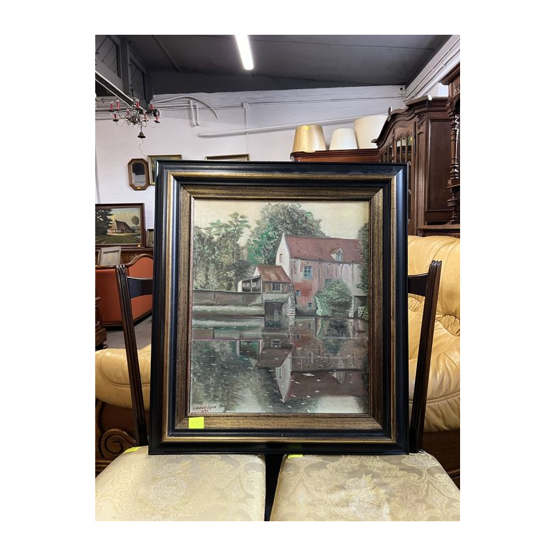 Ręcznie malowany obraz na płótnie przedstawiający malowniczy krajobraz z domami odbijającymi się w wodzie.