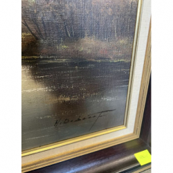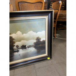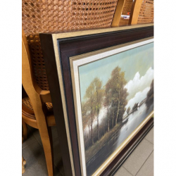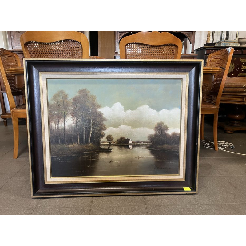 Malowany na płótnie obraz przedstawiający malowniczy krajobraz z domem nad jeziorem.