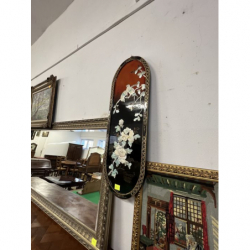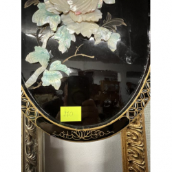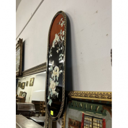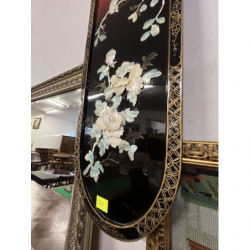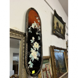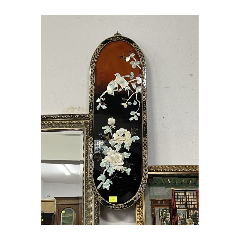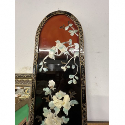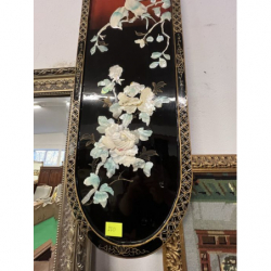 Przedmiotem sprzedaży jest piękny ozdobny japoński obraz przedstawiający kwiaty na czarnym tle, a wyżej ptaszki.