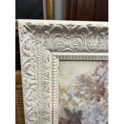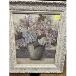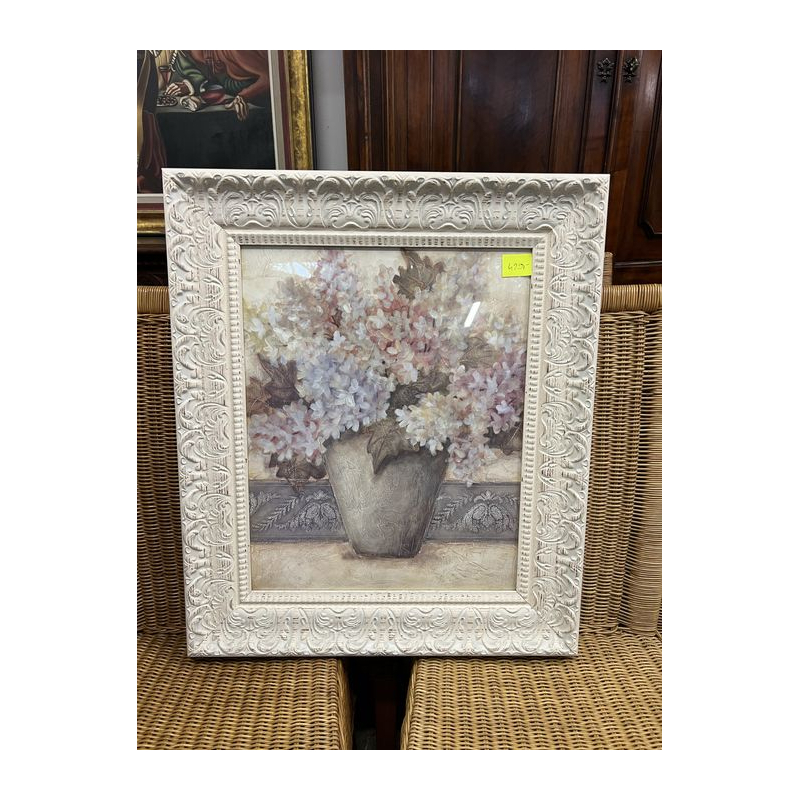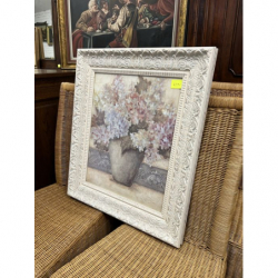 Przedmiotem sprzedaży jest piękny obraz w białej ozdobnej ramie przedstawiający bukiet kwiatów w wazonie.