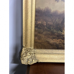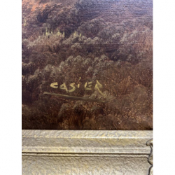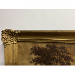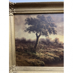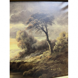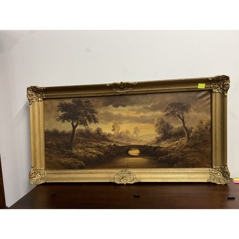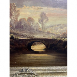 Przedmiotem sprzedaży jest malowany na płótnie obraz przedstawiający piękny krajobraz z mostem na rzece.