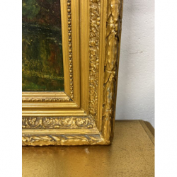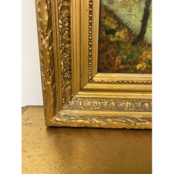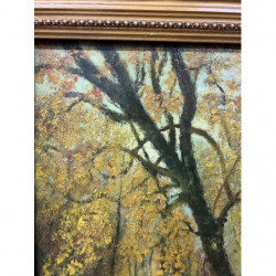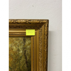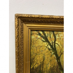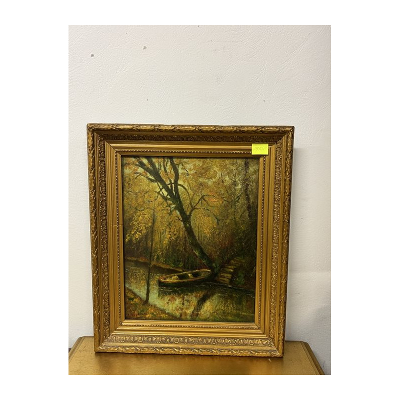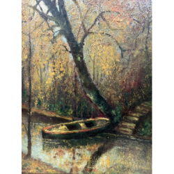 Przedmiotem sprzedaży jest obraz malowany na desce przedstawiający łódź na spokojnym jeziorze wśród drzew.