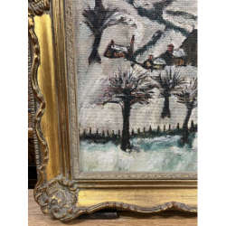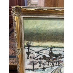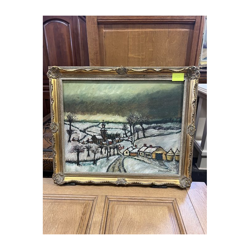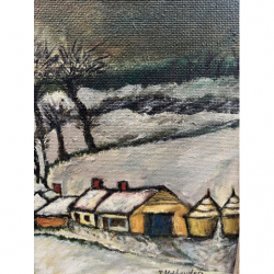 Malowniczy obraz przedstawiający zimowy krajobraz z wiejskimi domkami, drzewami i drogą.