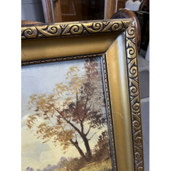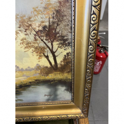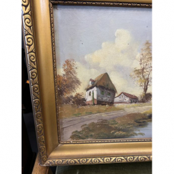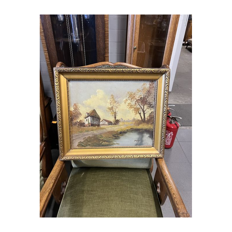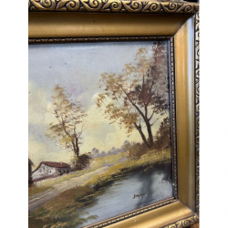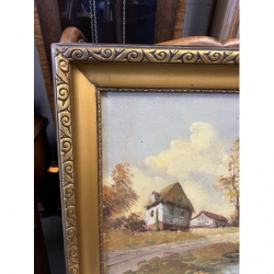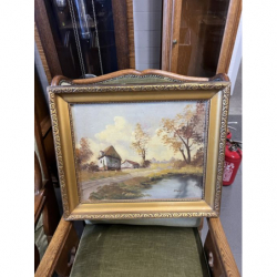 Malowany na płótnie obraz przedstawiający malowniczy krajobraz z domem, drzewami i rzeką.