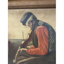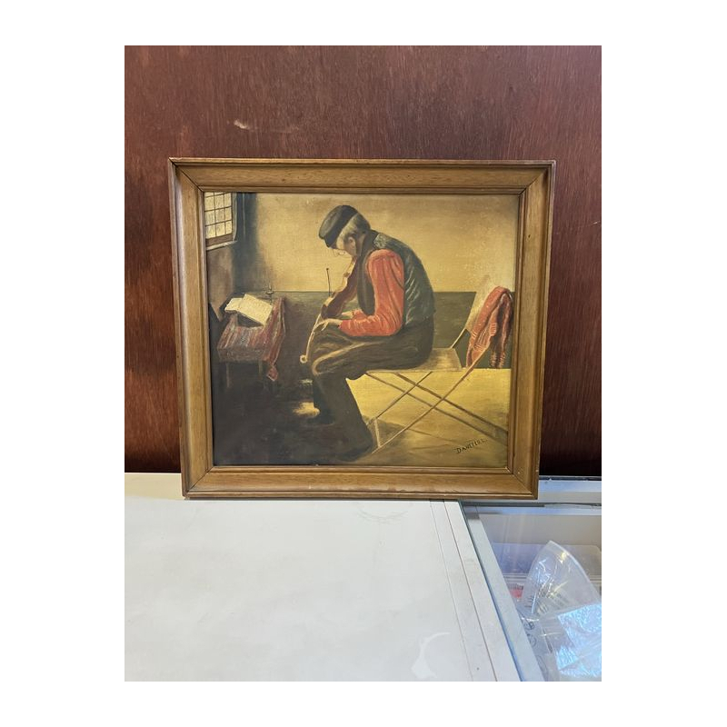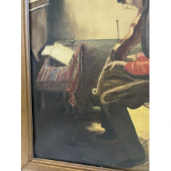 Na sprzedaż obraz malowany farbami olejnymi na płótnie, przedstawiający scenę rodzajową, mężczyznę grającego na skrzypcach.
