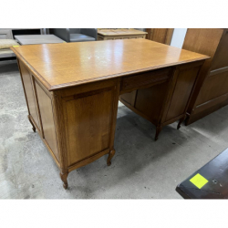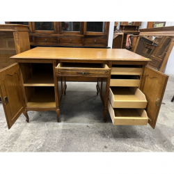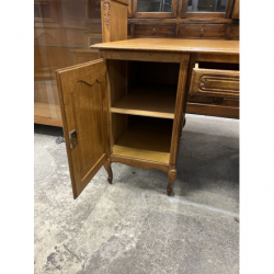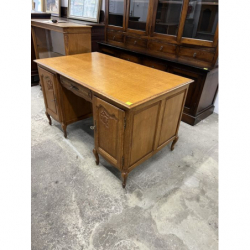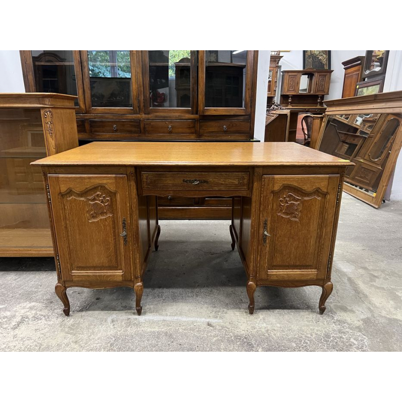 Używane, drewniane biurko w stylu ludwikowskim z szufladami w środku i rzeźbionymi detalami.