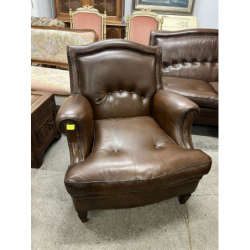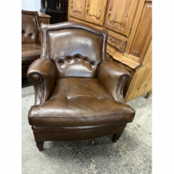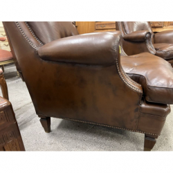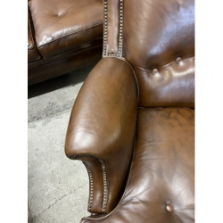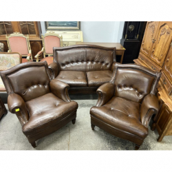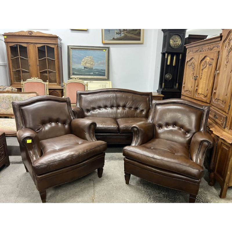 Skórzany komplet wypoczynkowy w brązowym kolorze, składający się z kanapy i dwóch foteli.