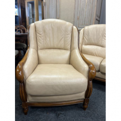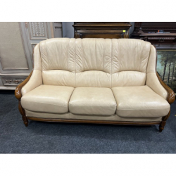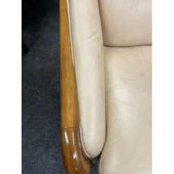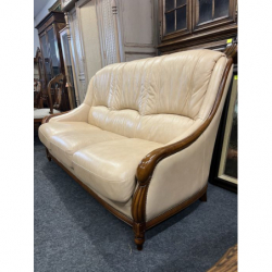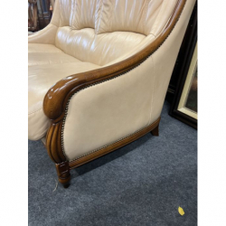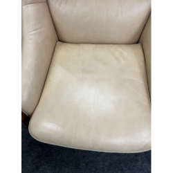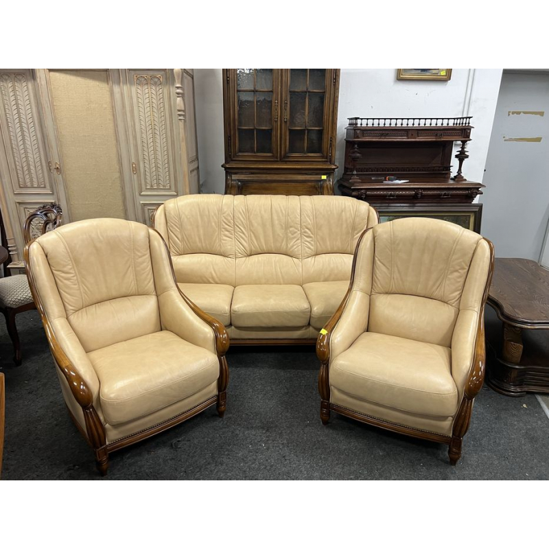 Zestaw wypoczynkowy w skórzanej tapicerce w kolorze kremowym.