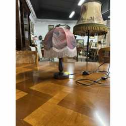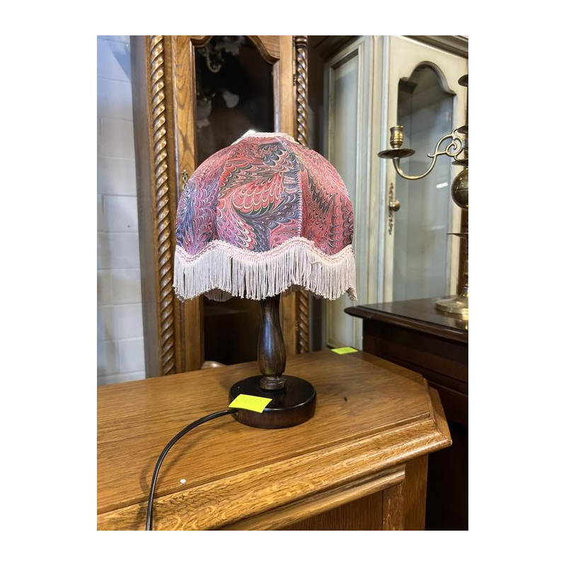 Abażur zdobiony jest wzorem w odcieniach różu i fioletu, a jego krawędzie zdobią frędzle.