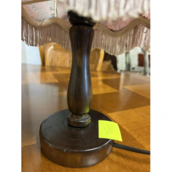 Podstawa lampy wykonana jest z ciemnego drewna, nadając całości elegancki wygląd.