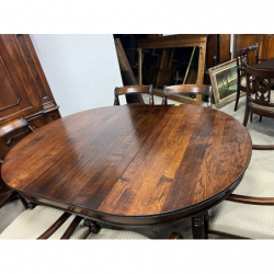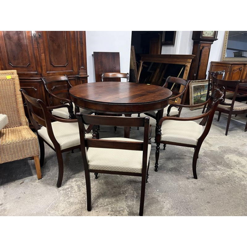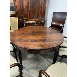 Przedmiotem sprzedaży jest drewniany, okrągły stół z 6 krzesłami, rozkładany, w ciemnym kolorze.