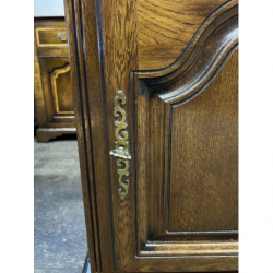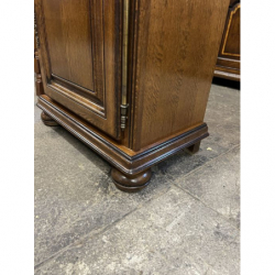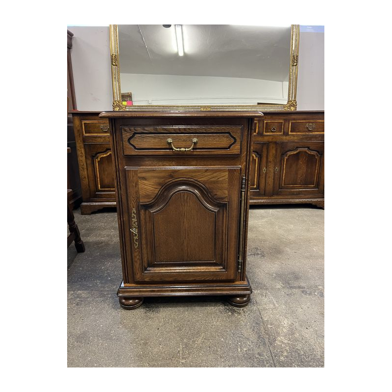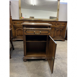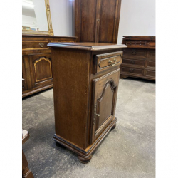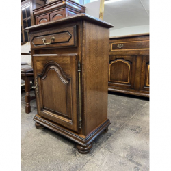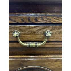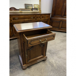 Posiada szufladę i drzwiczki zamykane na kluczyk z półką w środku.