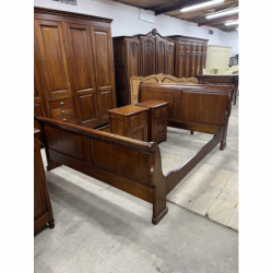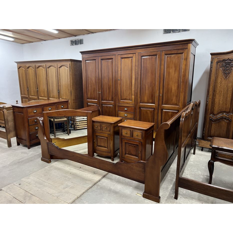 Przedmiotem sprzedaży jest stylowy zestaw mebli do sypialni, w skład którego wchodzi duża szafa, komoda, szafki nocne i lustro.