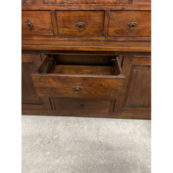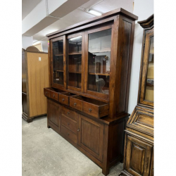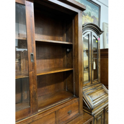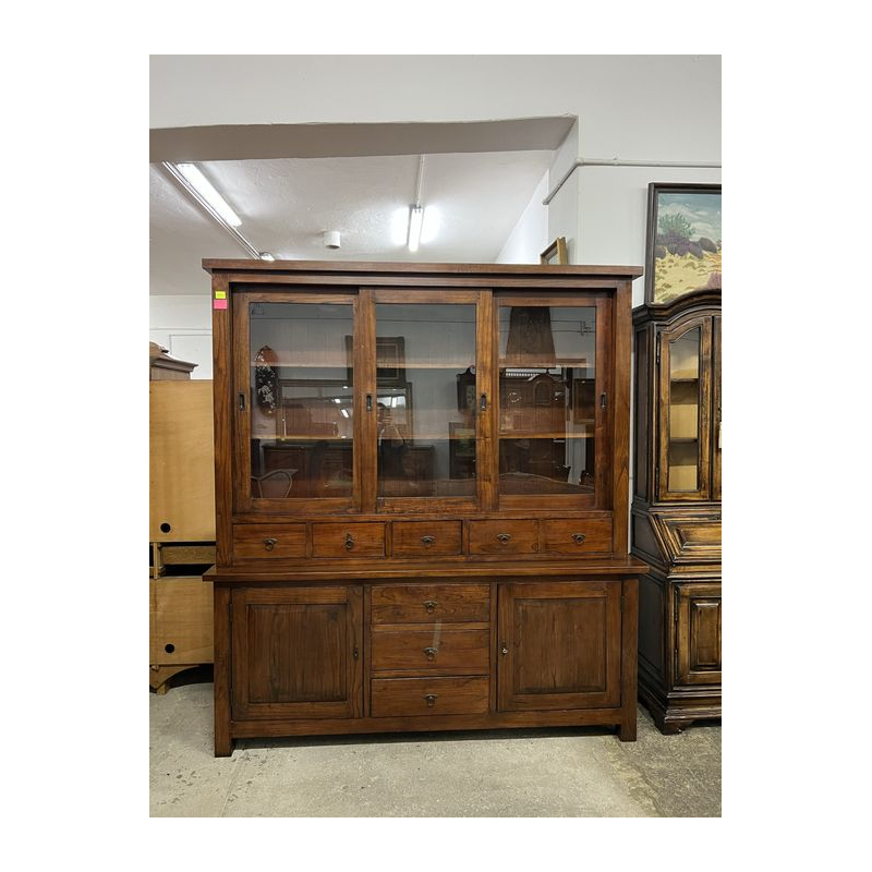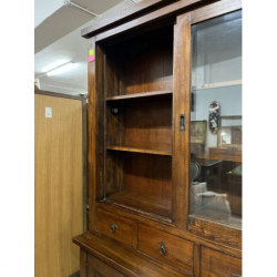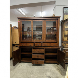 Ma przeszklone drzwiczki, szuflady i szafki na dole.