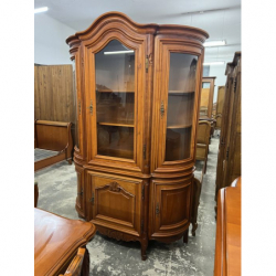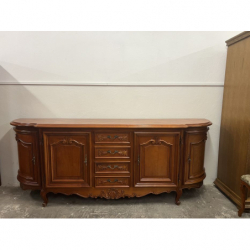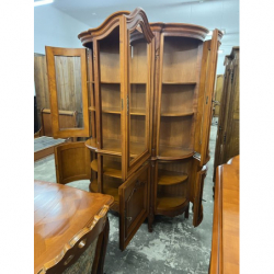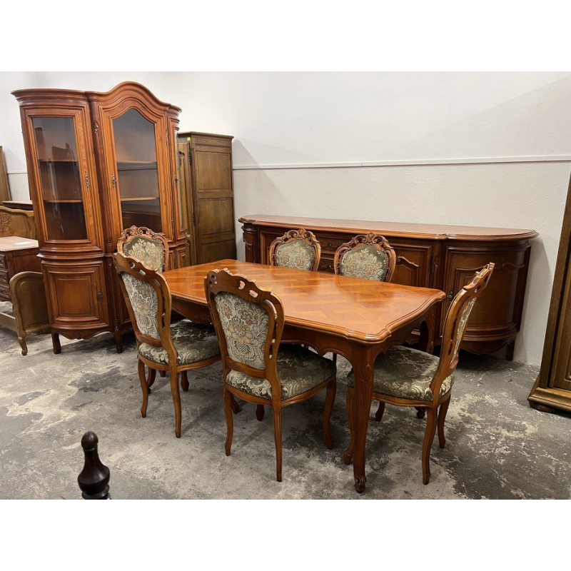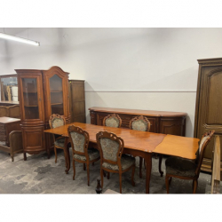 W skład zestawu wchodzą stół rozkładany z 6 krzesłami z rzeźbionymi oparciami, duża komoda i witryna.