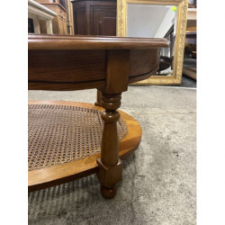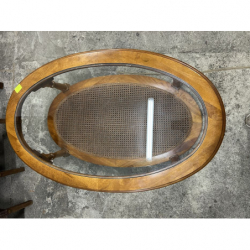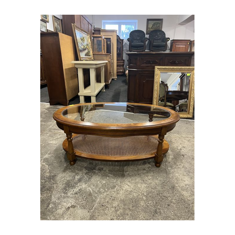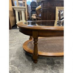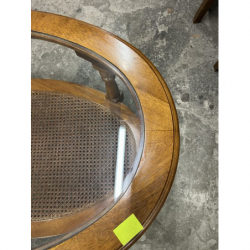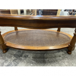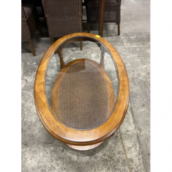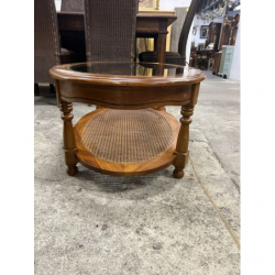 Przedmiotem sprzedaży jest stylowa ława z rafią w podstawie i szybą na blacie.