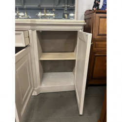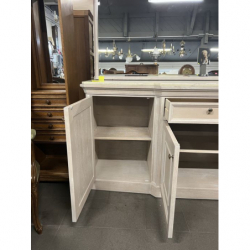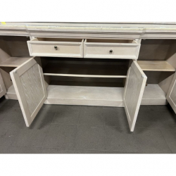 Komoda posiada dwie szuflady oraz cztery szafki z drzwiczkami i półkami w środku.
