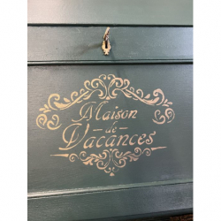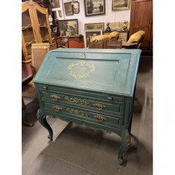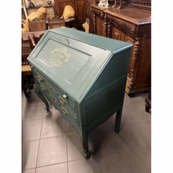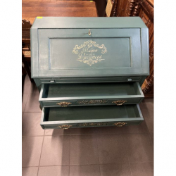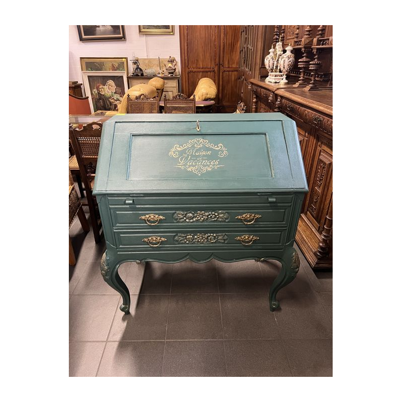 Stylowy sekretarzyk w butelkowej zieleni, z ozdobnymi okuciami i napisem "Maison Antique" na froncie.