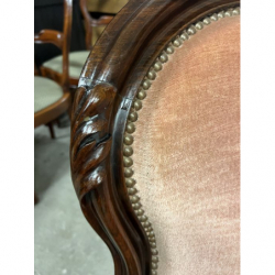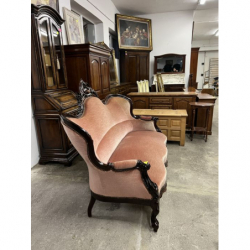 Tapicerka jest w kolorze różowym, a rama w ciemnym kolorze drewna.