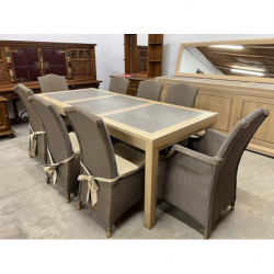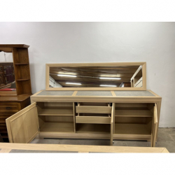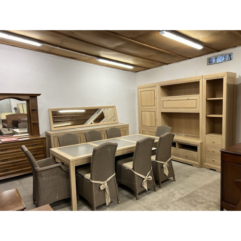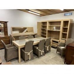 W skład jadalni wchodzą meblościanka z dużą ilością półek i miejscem na telewizor, komoda, duże lustro oraz stół i z 6 krzesłami i 2 fotelami.