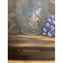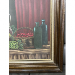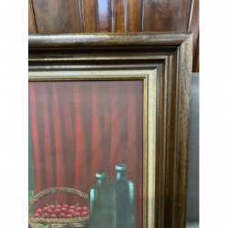 Piękna, ręcznie malowana kompozycja przedstawiająca naturę martwą z kwiatami, owocami i naczyniami.