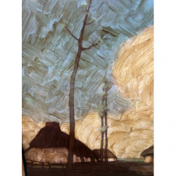Przedstawia wiejski krajobraz z chatami i drzewami.