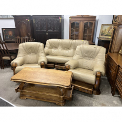 Wypoczynek Skórzany Na Dębowym Stelażu z ławą/3/1/1/Raty