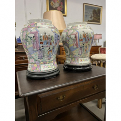 Opis przedmiotu:komplet: 2 wazy amfory, materiał: porcelana, styl: chiński, Famille Rose dekoracja: ręcznie malowane sceny figuralne z postaciami w tradycyjnych strojach, motywy kwiatowe, ornamenty.