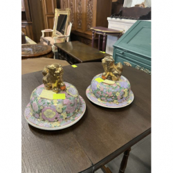 Każda waza posiada pokrywę zwieńczoną złotą figurką , w komplecie czarne, lakierowane podstawy.