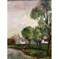 Przedstawia wiejski krajobraz z domkami, drzewami i rzeką.