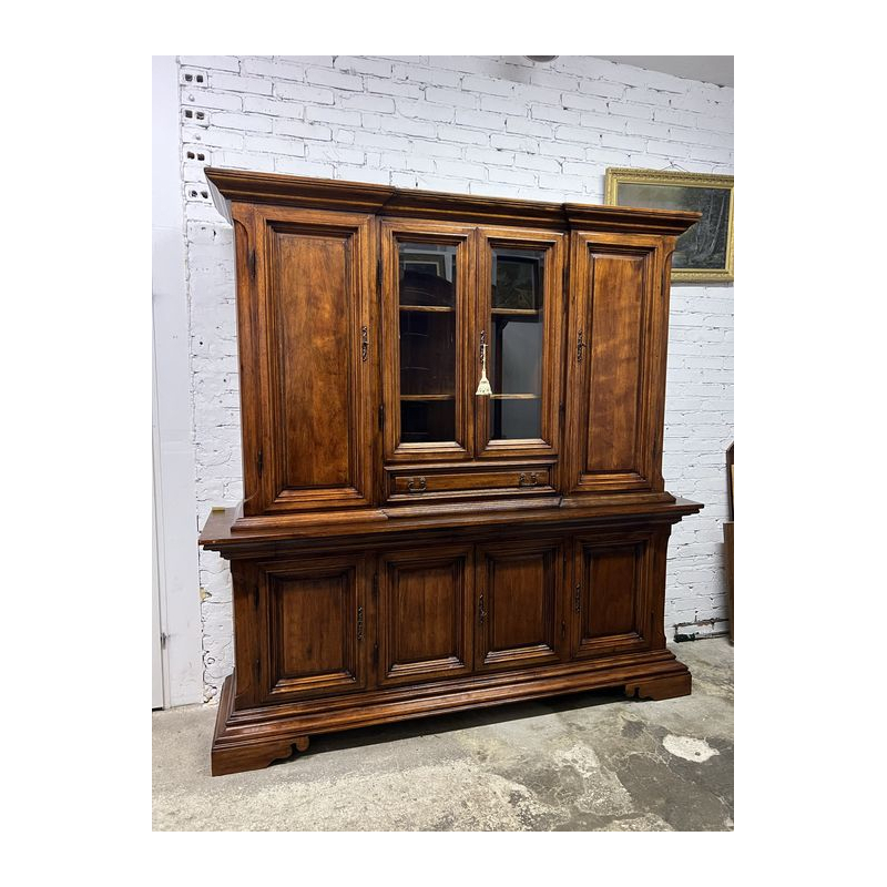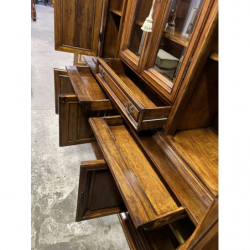 Góra ma po środku przeszklone drzwiczki na eksponowanie porcelany, a po bokach pełne z półkami w środku i pojemną szufladę.
