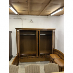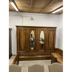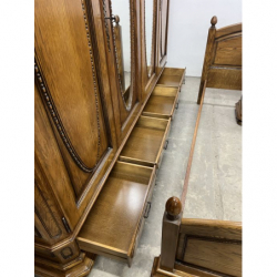 W skład zestawu wchodzą duża szafa 4 - drzwiowa z szufladami, dwie szafki nocne i łóżko.