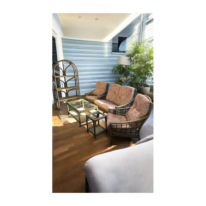 Stylowy zestaw mebli rattanowych, idealny do aranżacji salonu lub tarasu.
