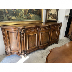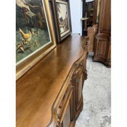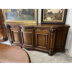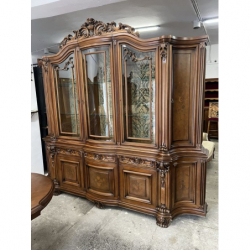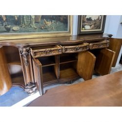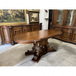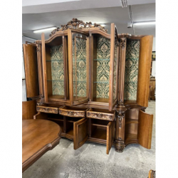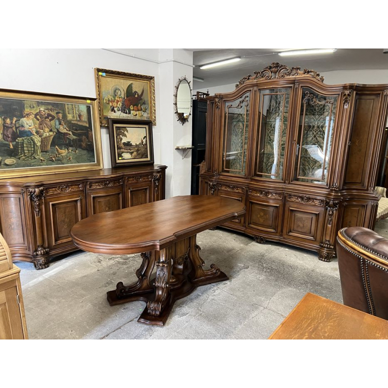 W skład zestawu wchodzi duży, owalny stół z rzeźbioną podstawą oraz duża, bogato zdobiona witryna i komoda.
