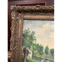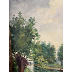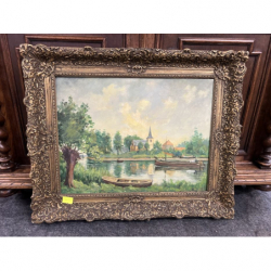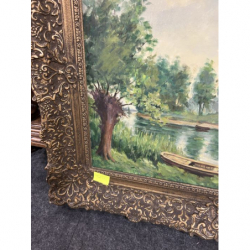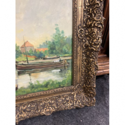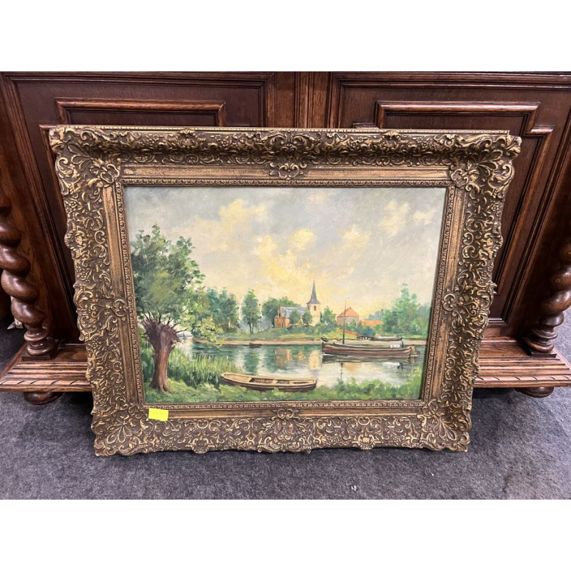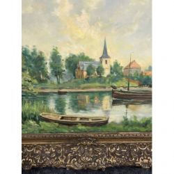 Piękny, stary obraz olejny przedstawiający malowniczy krajobraz z łódkami i drzewami.