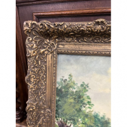 Rama obrazu jest bogato zdobiona złotymi ornamentami, nadając całości elegancki i klasyczny wygląd.
