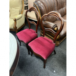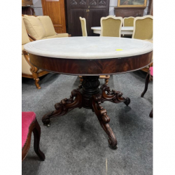 Przedmiotem sprzedaży jest okrągły stół z blatem marmurowym na rzeźbionym nodze wraz z 4 krzesłami w czerwonym obiciu.