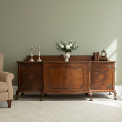 Mebel posiada dekoracyjne zdobienia i nadaje się do aranżacji wnętrz w klasycznym stylu.