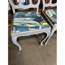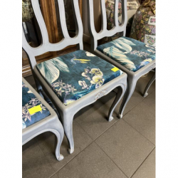 Siedziska otrzymały nową tapicerkę – tkaninę o oryginalnym, tropikalnym wzorze z ptakami i roślinami, która dodaje całości świeżości i niepowtarzalnego stylu.