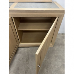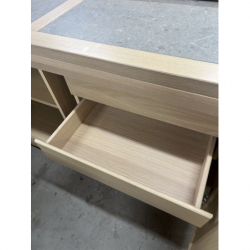 Mebel wyróżnia się ponadczasowym designem, jasnym wybarwieniem drewna oraz stylowym blatem z dekoracyjnymi kamiennymi wstawkami.