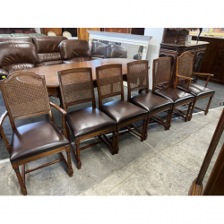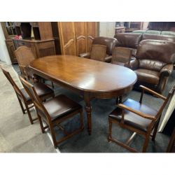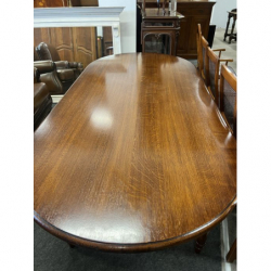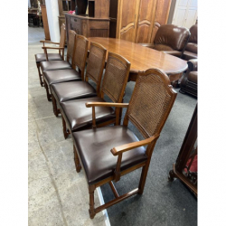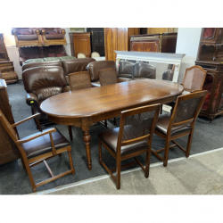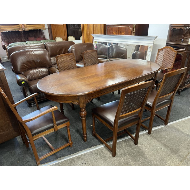 Solidny, owalny stół dębowy z 6 krzesłami z rattanu.
