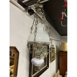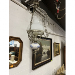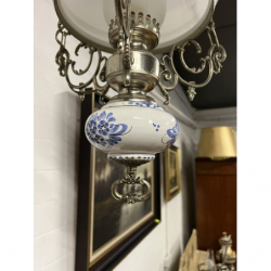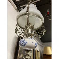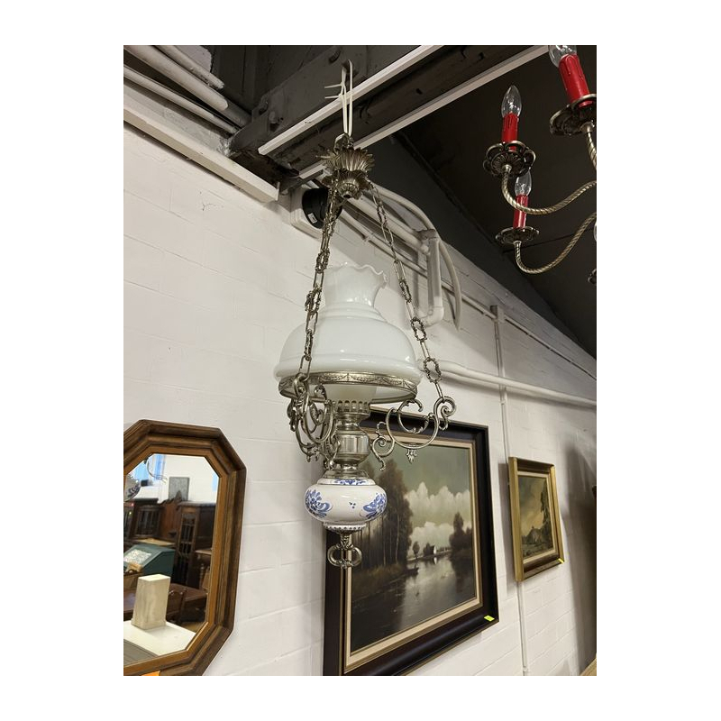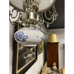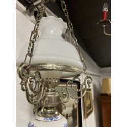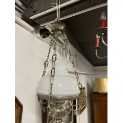 Przedmiotem sprzedaży jest mosiężny żyrandol z białym kloszem.